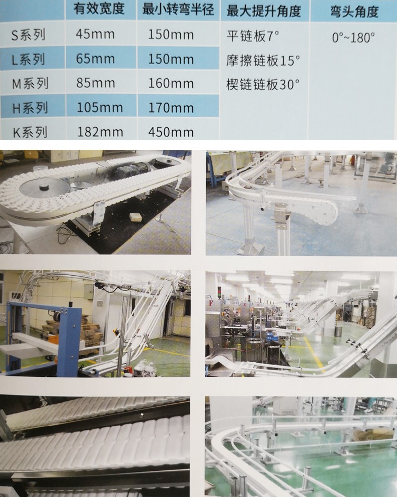 該輸送機使用POM鏈板,表面光滑,摩擦力小,機身有碳鋼和不銹鋼,能滿足各行業(yè)不同需求。便于清潔,-般都可以直接沖洗。設備結(jié)構(gòu)簡單,維護方便。鏈條寬度從82.6mm至304. smm等多種規(guī)格,最小轉(zhuǎn)彎半徑200mm。
